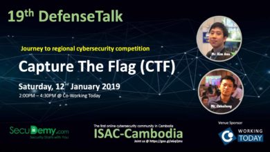 រាជធានីភ្នំពេញ៖ នារសៀលថ្ងៃទី១២ ខែមករា ឆ្នាំ២០១៩ ក្រុមការងារវេបសាយ SecuDemy សហការណ៍ជាមួយនឹង Co-Working Today មានរៀបចំកម្មវិធីសហគមន៍ DefenseTalk លើកទី១៩ ក្រោមប្រធានបទ “Capture The Flag (CTF)” ដែលមានការចូលរួមដោយសេរីពីសំណាក់សិស្ស-និសិ្សត និងបុគ្គលិកក្រុមហ៊ុន និងអង្ភភាពពាក់ព័ន្ធមួយចំនួនទៀត។…