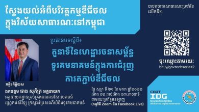 មជ្ឈមណ្ឌលជំរុញអភិបាលកិច្ច និងបច្ចេកវិទ្យាឌីជីថលនៃវិទ្យាស្ថានអភិបាលកិច្ចឌីជីថលមានកិត្តិយសនាំមកជូននូវកម្មវិធី «ស្វែងយល់អំពីបរិវត្តកម្មឌីជីថលក្នុងវិស័យសាធារណៈនៅកម្ពុជា» ដែលរៀបចំជាបាឋកថាជាសាធារណៈប្រចាំខែ លើកទី ២។ ប្រធានបទស្តីពី៖ «តួនាទីនៃហេដ្ឋារចនាសម្ព័ន្ធទូរគមនាគមន៍ក្នុងការជំរុញការតភ្ជាប់ឌីជីថល»