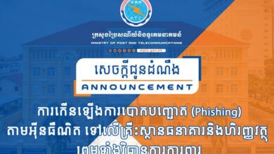 យោងតាមការផ្សាយរបស់ ក្រសួងប្រៃសណីយ៍និងទូរគមនាគមន៍ បានចេញផ្សាយសេចក្តីជូនដំណឹង ស្តីពី ការកើនឡើងការបោកបញ្ឆោត (Phishing) តាមអុីនធឺណិត ទៅលើគ្រឹះស្ថានធនាគារនិងហិរញ្ញវត្ថុ ព្រមទាំងវិធានការការពារ សម្រាប់អ្នកដែលចង់តាមដានព័ត៌មាននៅក្នុងស្មាតហ្វូន អាចធ្វើការទាញយក App នៅក្នុង AppStore &PlayStore ។ ចូលរួមទៅក្នុងបន្ទប់ផ្តល់ព័ត៌មាន Telegram channel សម្រាប់ទទួលបានព័ត៌មានចុងក្រោយស្តីពីសន្តិសុខអុិនធឺណិតទាំងក្នុង…
